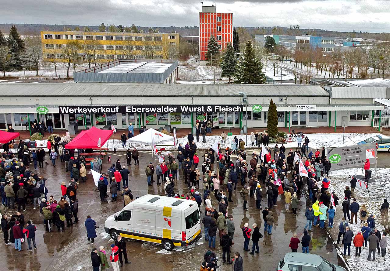 Mehr als 500 Menschen kamen am »Valentinstag« zur »Trauerfeier« nach Britz, um vor dem Werktor des einstigen Schlacht- und Verarbeitungskombinats Eberswalde (SVKE), zuletzt »Eberswalder Wurst«, ihre Trauer und Wut über die Entscheidung des Fleisch-Milliardärs Tönnies zu artikulieren, der drei Jahre nach Übernahme zum Ende des Monats das Werk schließen läßt. Thomas Gädicke, dessen Rede zur Trauerfeier wir nebenstehend wiedergeben, hatte sein ganzes Berufsleben in dem Betrieb verbracht und engagierte sich viele Jahre als Mitglied im Betriebsrat für die Interessen der Beschäftigten.