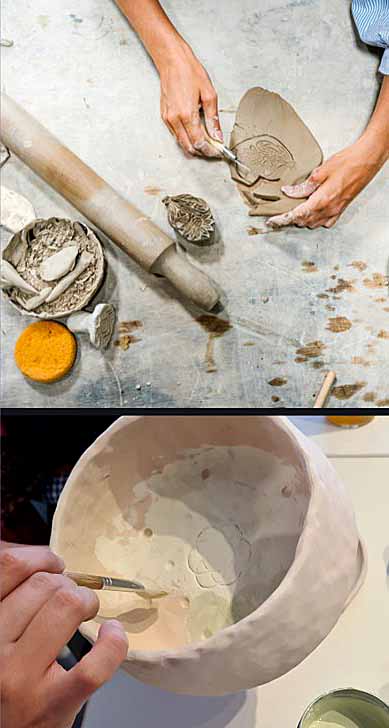 Nach dem Workshop trocknen die Töpferei-Werke einige Wochen, bevor sie gebrannt werden, um sie stabil genug für die Glasuren zu machen. Beim Glasurtermin werden pinselfertige Hochbrand-Glasuren verwendet. »Nach einer kurzen Einleitung kannst Du drauf los pinseln und dabei aus bis zu 20 Farben wählen (glänzend oder matt, halbtransparent oder nicht).«
