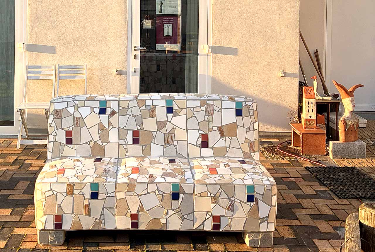 Zur Einweihung lädt die Galerie Fenster am Gründonnerstag, dem 2. April, von 16 bis 19 Uhr zum »Sofa Fest« ein. Bei dem Sofa handelt es sich um eine herrliche Mosaikplastik von Anne Ochmann, die auf dem Hof vor der Galerie Aufstellung finden wird. Als erste darf die Akkordeonistin Cathrin Pfeifer dort Platz nehmen, denn sie wird um beginnend um 17 Uhr ein kleines Konzert geben.
