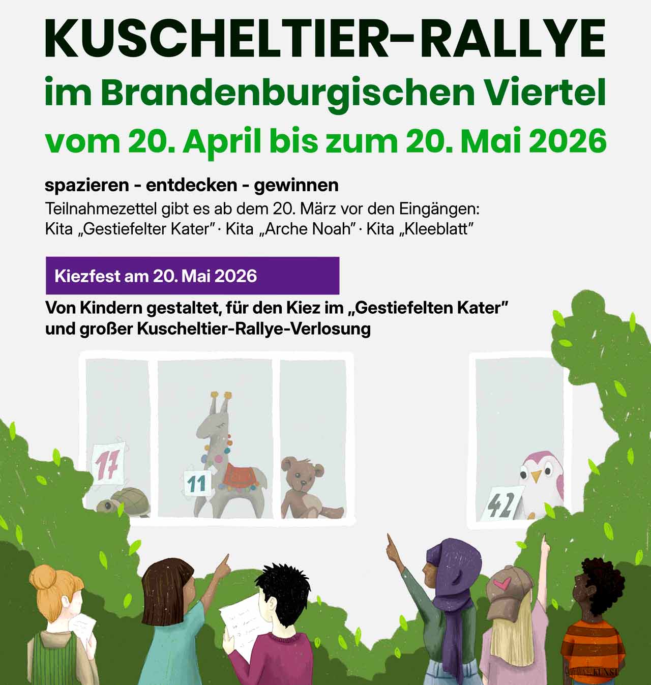 Seit dem 20. April sind kleine und große Entdeckerinnen und Entdecker eingeladen, gemeinsam mit ihrem Lieblingskuscheltier auf eine besondere Rallye zu gehen. Im ganzen Viertel warten verschiedene Stationen mit Nummern darauf, entdeckt zu werden.