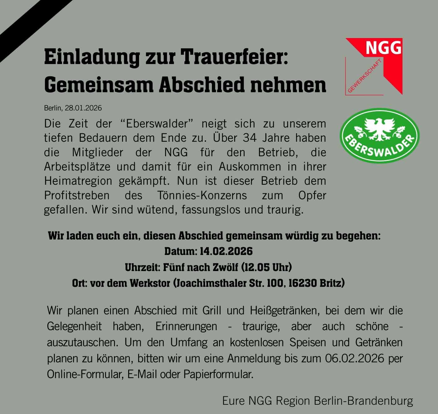 Die Gewerkschaft Nahrung-Genuß-Gaststätten (NGG) hat für Sonnabend, den 14. Februar, um Fünf nach Zwölf (12.05 Uhr) bisherige und ehemalige Beschäftigte sowie Interessenten anläßlich der bevorstehenden Betriebsschließung zu einer Trauerfeier eingeladen.