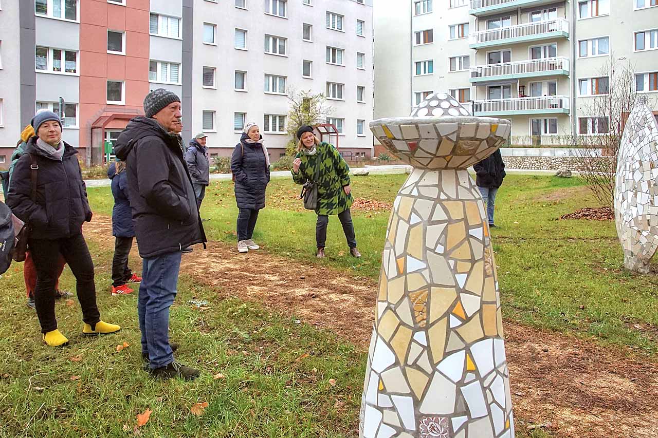 Der Weg führt zu den im Vorjahr aufgestellten Mosaikplastiken von Anne Ochmann im Oderbruch Quartier. Desweiteren zu sehen sind von 2022 bis 2024 in Hauseingangsbereichen realisierte Arbeiten von Ina Abuschenko-Matwejewa, DAG, Gudrun Sailer und Henning Wagenbreth.