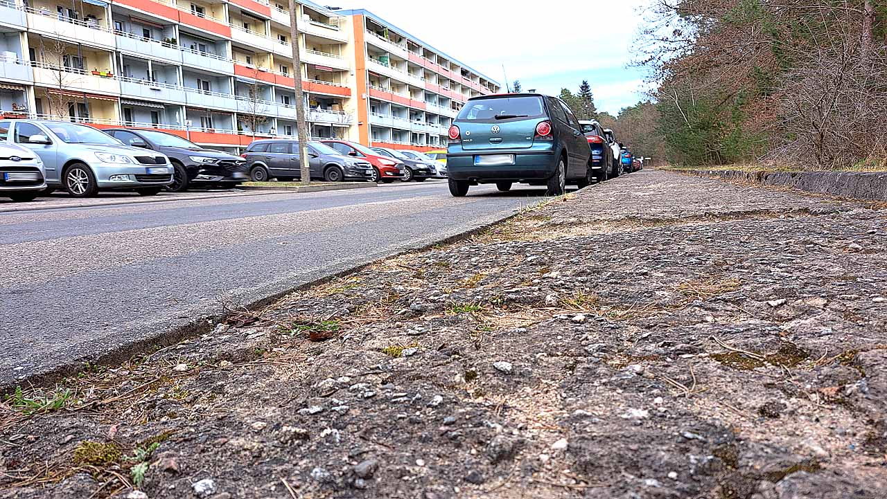 Für einen »richtigen Radweg« in der Lausitzer Straße, wie ihn der Stadtverordnete Oskar Dietterle von der Fraktion Die PARTEI Alternative für Umwelt und Natur gefordert hatte, müßten Bäume gefällt werden, wandte der städtische Baudezernent Ilja Haub ein. Tatsächlich ist der alte Gehweg auf der Südseite der Lausitzer Straße völlig marode und müßte für einen »richtigen Radweg« ersetzt und verbreitert werden. Bäume allerdings wurden dort bereits jetzt gefällt (siehe Foto).