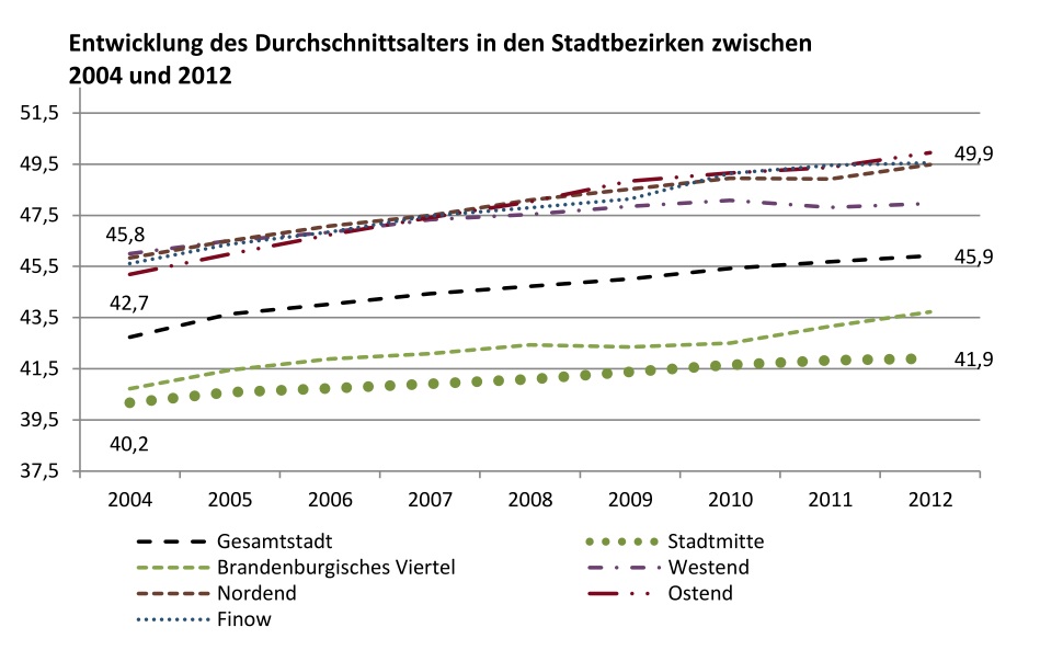 Im Jahr 2014 gingen die Planer davon aus, daß sich das Durchschnittsalter in der Gesamtstadt von 46 Jahren auf 47,8 Jahre im Jahr 2020 und 50,3 Jahre im Jahr 2030 erhöhen wird. Die Nachfragestrukturen werden sich verändern und die älteren Menschen werden als Konsumentengruppe zunehmend eine größere Rolle einnehmen. (INSEK Seite 30)