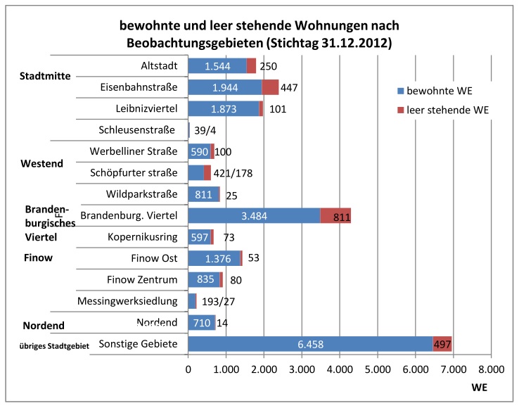 Der Wohnungsrückbau erfolgte im Zeitraum 2002 bis 2012 in diesen Dimensionen: Stadtmitte (230), Westend (38), Finow (148), Brandenburgisches Viertel (1227), Nordend (184) und Ostende (36). Über die Jahre verteilt, ergab sich folgendes Gesamtbild: