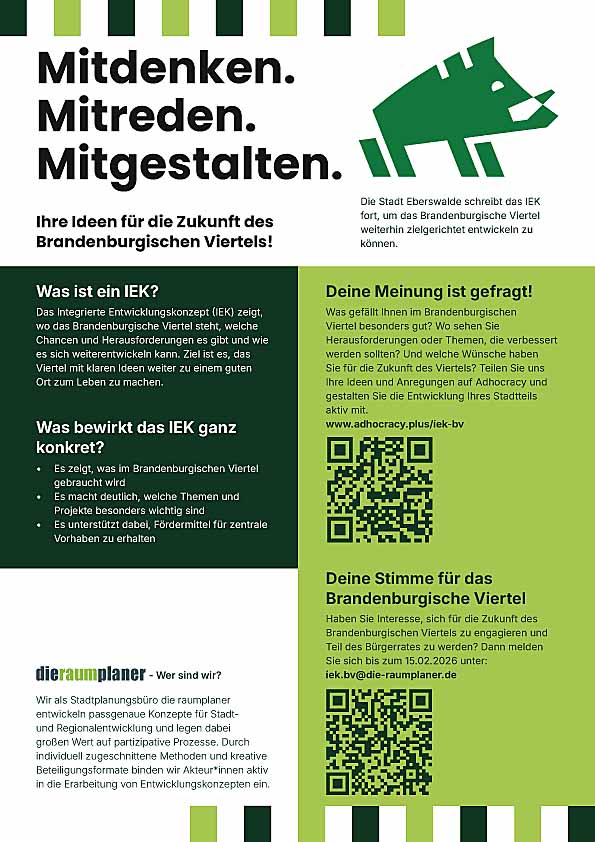maxe. Im Herbst hat die Stadt Eberswalde das Berliner Ingenieurbüro »die raumplaner« mit der Erarbeitung eines neuen Integrierten Entwicklungskonzepts (IEK) für das Brandenburgische Viertel beauftragt. Dort federführend beteiligt ist Julia Klemm (eMail: